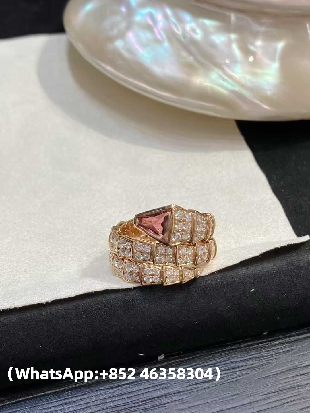 This magnificent 3-row ring from Bulgari’s alluring Serpenti collection is crafted in 18k rose gold and fully pave-set with 122 round brilliant-cut E-F-G VVS1-VVS2 diamonds of an estimated 2.42 carats