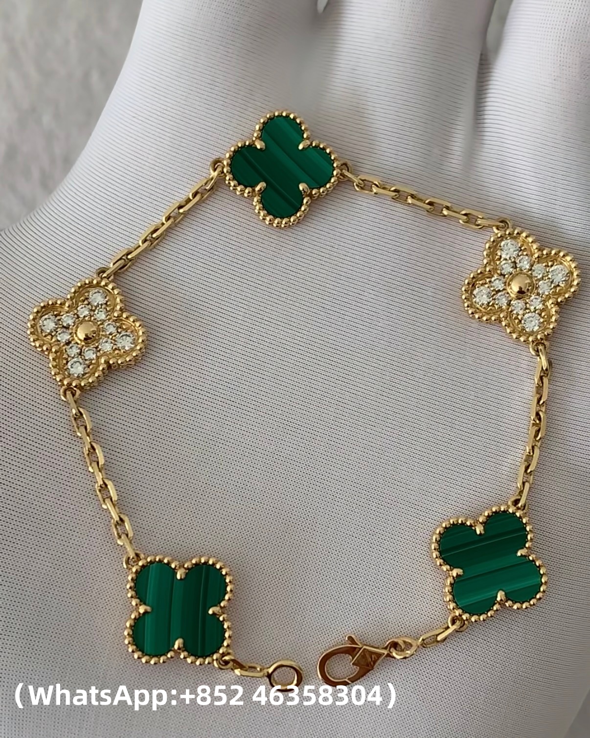 Vintage Alhambra bracelet, 5 motifs, 18K yellow gold, malachite, round diamonds; diamond quality DEF, IF to VVS.